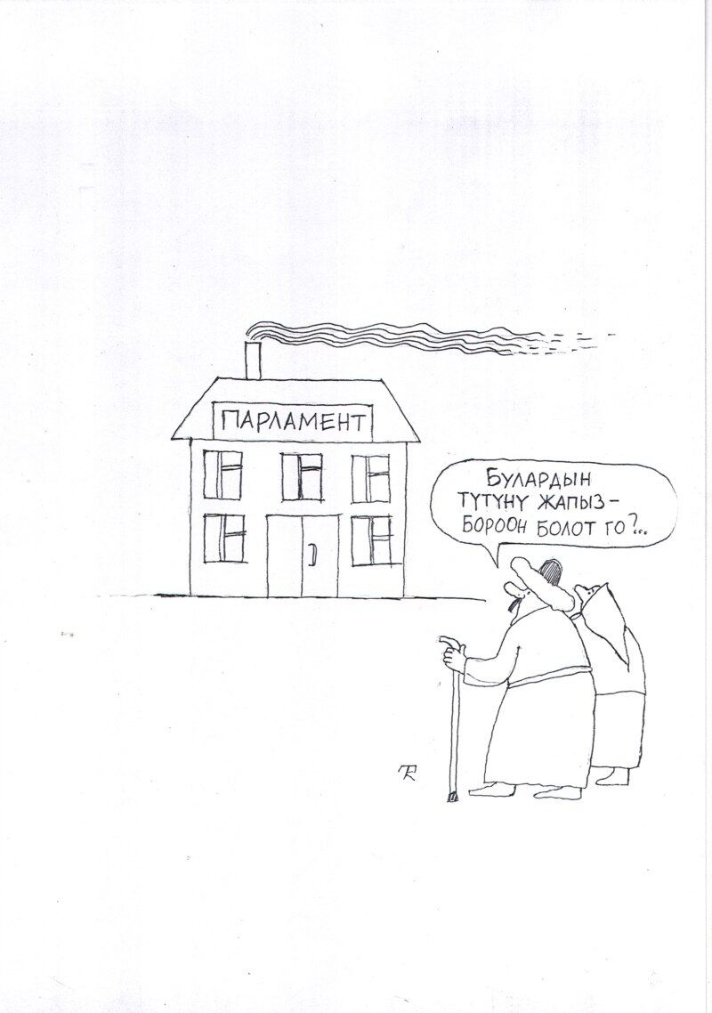 Дым отечественного парламента 14 апреля 2011 Карикатурист Кимбайке (Т.Карыкеев) о перипетиях политического климата в Кыргызстане. Дымит слишком низко, значит, приближается ураган! Кимбайке. 3.4.2011.